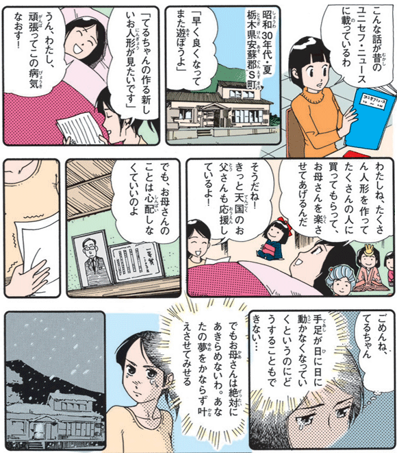 世界では、予防接種で予防できるポリオ(小児まひ)根絶(こんぜつ)まであと一歩のところまでたどりついています。かつて日本でもポリオが流行した時代がありました。ユニセフの支援で希望をとりもどした日本の女の子のお話です。