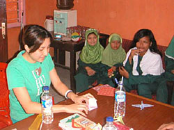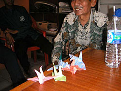 折り紙でつるなどを教えてあげました。さいしょは照れていましたが、だんだんみんないっしょにつくってくれました。 |