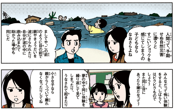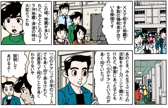 日本でも、自然災害やひさんな事故があると、子どもたちの心のケアがたいせつだといわれています。心のケアは、おもに専門家によるカウンセリングを意味していますが、ユニセフが行っている心のケアとは、どんなことをしているのでしょうか。