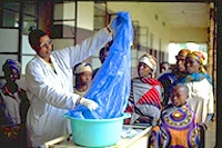 | 蚊帳に殺虫剤をしみこませて、マラリア蚊をよせつけないようにする方法を、看護婦が実演しているようす(ルワンダ) |
