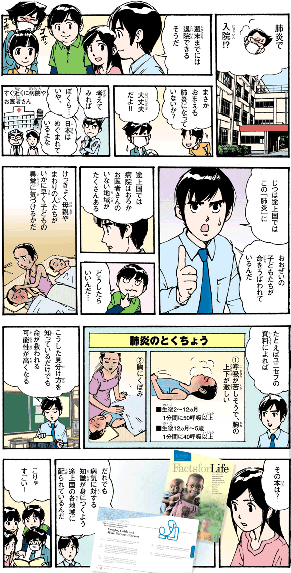 5歳未満の子どもの命をうばう病気のなかで、一番多いのが肺炎です。途上国では、特に問題になっている病気です。世界では、この肺炎がどんな問題をひきおこしているのでしょうか。