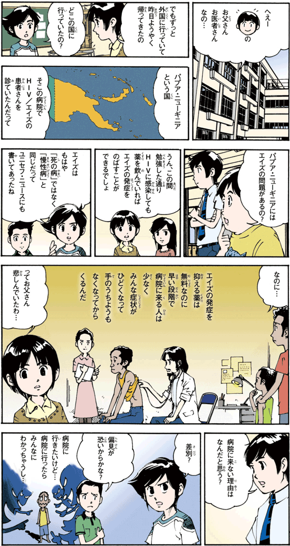 世界で猛威(もうい)をふるっているHIV/エイズ。感染者は世界で3950万人いるといわれています。今回はパプア・ニューギニアでのHIV/エイズの問題をとおして、考えてみましょう。
