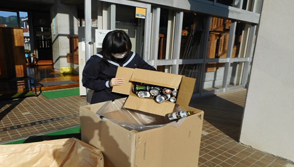生徒会本部では伝統となっている「アルミ缶回収活動」を先輩から引継ぎ、継続させています。アルミ缶を換金し、様々な方面への支援に役立てる目的で「東日本大震災の被災地への募金」「熊本地震の被災地への支援」「新潟県糸魚川の大規模火災からの復興支援」などを行ってきました。