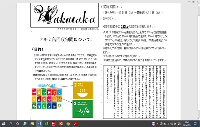 今回のアルミ缶回収でたくさんの地域の方々にも協力して頂いたことが心に残っています。近所の方にも生徒自ら声をかけ、280kgものアルミ缶を集められました。一人一人がアルミ缶回収に対して、一生懸命に取り組んだことで、世界中の子どもたちを助けられることをとてもうれしく思います。さらに、SDGsの「2 飢餓をゼロに」と「3 すべての人に健康と福祉を」に貢献できたと思うと、これからも似たような活動に進んで取り組みたいと思いました。