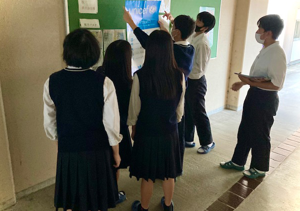 弁論大会を受けて、生徒会から「ユニセフ学校募金に取り組みたい」という声が上がりました。企画書の作成、文書と放送による告知、ユニセフのテーマポスターの掲示を行い、校内で2週間の募金活動を実施しました。その結果、生徒や先生方から総額21,585円が集まり、ユニセフに募金をすることが出来ました。