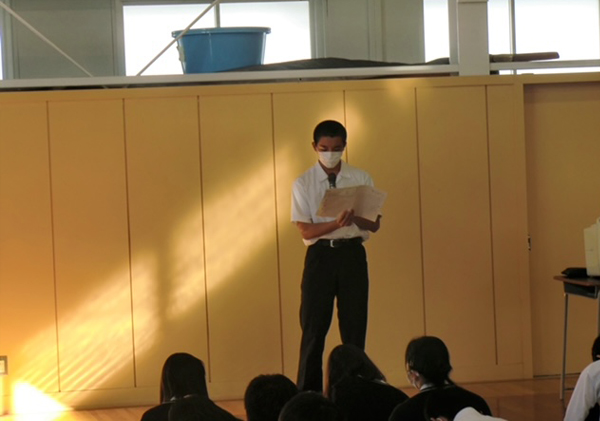 本校では毎年、テーマに沿って全校生徒が1,000字程度の意見文を書いて発表し合うという弁論大会が行われています。今年度は、「SDGs」をテーマに弁論大会を行いました。国語の授業で調べ学習を行い、世界で起きている問題や行われている対策についての知識を得ました。意見文の中で生徒たちは、「学校に通えない子どもが減って欲しい」「一人一人が、貧困に終止符を打たなければならないという意識を持つべき」「寄付やボランティアなど、今の自分が飢餓や貧困状態の方のためにできることに精一杯取り組みたい」「募金など、小さなことでもその行動が周りに影響を与え大きなものに変わっていくことを信じたい」等と自分の考えを示していました。コロナ渦であるため、全校大会は行うことができませんでしたが、各学年で学年予選会を行いました。発表をしたクラスの代表者もスピーチを聞いていた他の生徒も、真剣にSDGsと向き合っているように感じられました。
