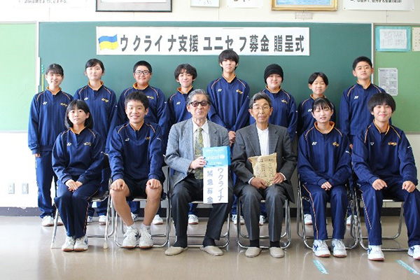 生徒総会で各学級から出された意見をもとに、5月にはユニセフ募金に協力する取組をおこなうこととしました。ボランティア委員会が各学級で呼びかけたほか、吹奏学部のコンサートでも募金活動を行いました。集まった募金は、岩手県ユニセフ協会“花巻友の会”の林正文会長と櫻田正巳さんに来校いただき、贈呈しました。
