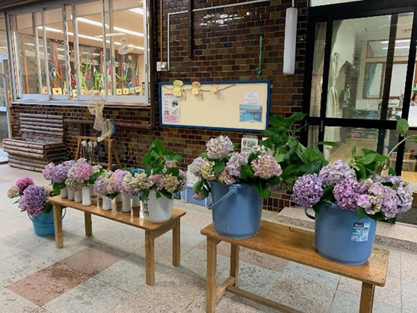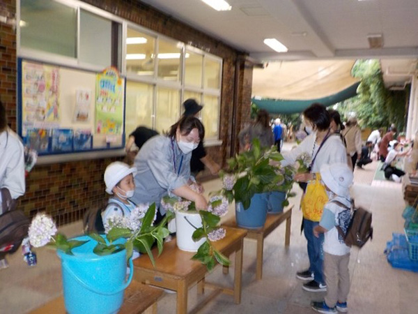 今年度は、コロナ前に行っていた「あじさいチャリティ」を、数年ぶりに実施することができました。子どものお迎え時に、募金をしてくださった方に、園のあじさいを一輪ずつ差し上げました。季節の花を親しむと共に、親子で募金にご参加いただくことで、ユニセフへの親しみを持ってもらうことを目的としております。保護者や子どもたちに大好評で、合計250名にご参加いただきました。美しい花をもらって、みんなの笑顔の花が咲きました。
