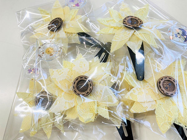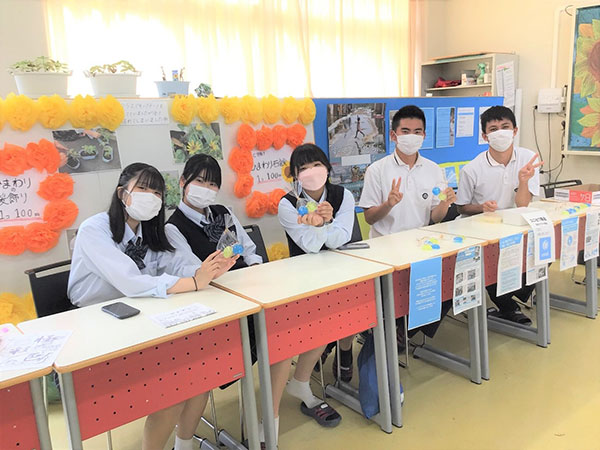 文化祭当日、教室展示にひまわりの黒板アートやフォト・スポットをつくってウクライナに関心をもってもらい、また、ウクライナカラーの黄色と青色で「手作り石鹸」と、「ひまわりの髪留め」の2つを作って、販売しました。それらの売り上げと共に、来場者の方には募金もお願いして、クラス全員で募金活動を行いました。