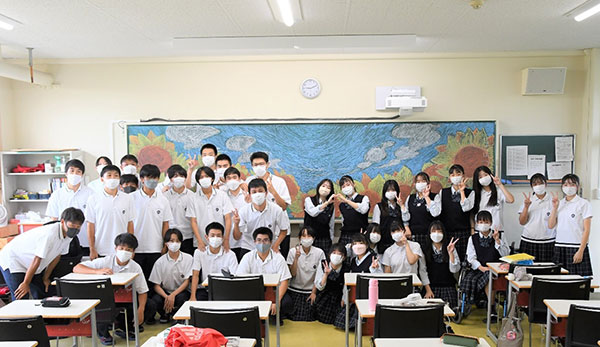 2022年度の文化祭クラス企画で、3年C組は、ウクライナ問題・平和問題を取り上げました。ウクライナ紛争が日本や私たちにどのような影響をおよぼすかなどを調べ、展示発表しました。企画内容を相談する中で、「ウクライナの人々のために何かしたい!」「SDGsの観点からも、文化祭2日間が終わった後に、展示物をゴミにするのではなく、つくったものを何かに役立てよう!」との声が上がり、ウクライナの国花「ひまわり」をモチーフにした企画を立ち上げました。