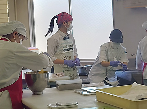 昨年に引き続き2024年5月から2025年2月までの間、暑い時期の8月を除く毎月1回日曜日に本校通信制高校の有志たちがボランティア活動を行いました。さいたま市大崎公園で地元の野菜を使った手作りのお菓子を販売し、収益の一部をユニセフに寄付するという活動です。本学短期大学製菓専門の先生の指導のもと、本格的なおいしいパウンドケーキやマドレーヌなどのお菓子を作り販売することができました。