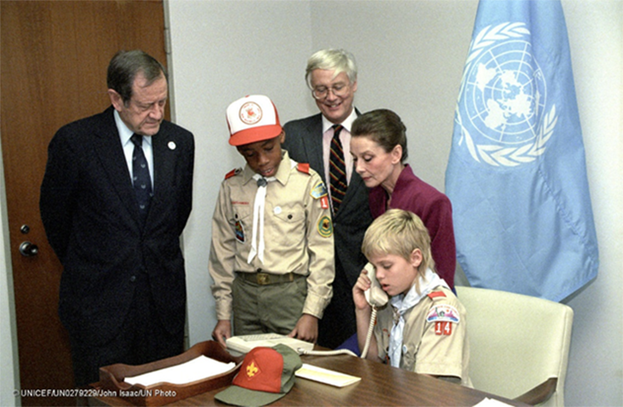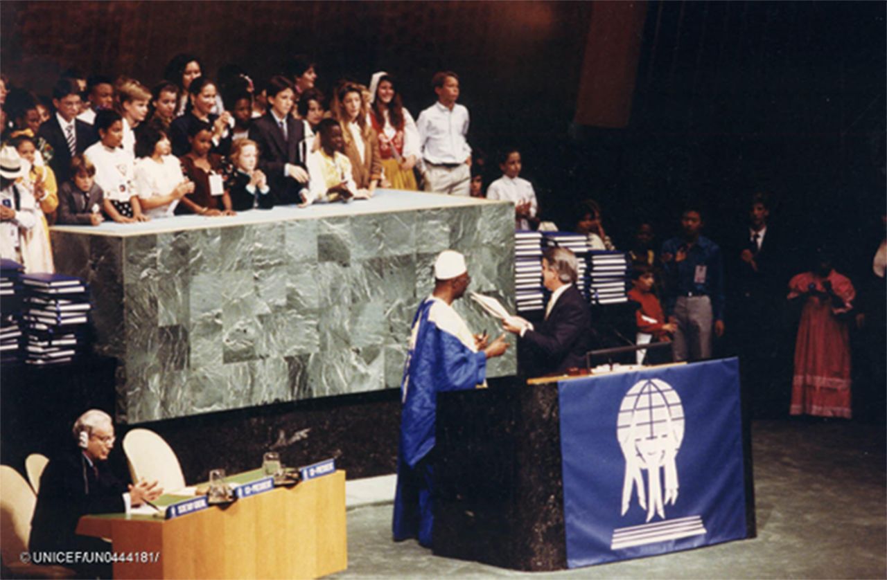 「子どもの権利条約」が発効※し、子どもに関する問題に世界が力を合わせて取り組んでいこうとよびかけるため国連本部で「子どものための世界サミット」が開かれました。152か国の政府の代表が参加した、子どもに関するはじめての大きな国際会議でした。この会議では、赤ちゃんや子どもの死亡率を下げること、栄養が足りない子どもを減らすこと、すべての子どもが教育を受けられるようになることなど、2000年までの達成を目指す7つの目標が決められました。目標の達成に向けて世界の国ぐにが力を合わせていくことが約束されました。
