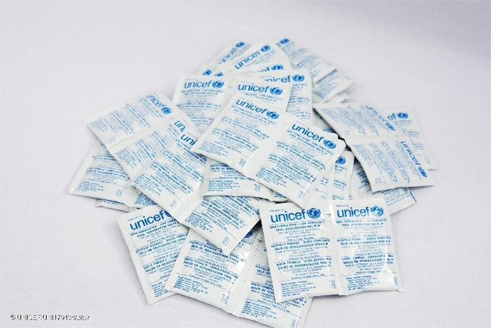 食塩とブドウ糖、ミネラルが配合された粉末です。安全な水1リットルに混ぜて飲むことで、より早く効率的に水分を補給することができます。げりやおうと、発熱などによる危険な脱水症状から子どもたちを救うのに役立つ緊急支援パッケージの1つです。
