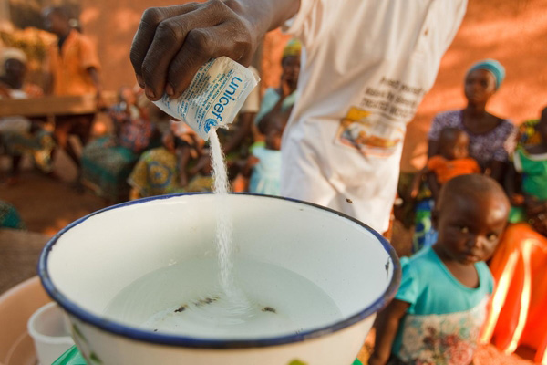 ユニセフは、脱水症状から子どもの命を守るため、からだに吸収されやすい水を作って飲ませる「経口補水療法(けいこうほすいりょうほう)」という治療法を広めています。この方法でつくるスペシャルドリンクは、ふつうの水よりも早くからだに吸収されます。