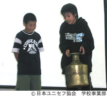 学校のプログラムでは、ビデオ上映などによるユニセフ活動の説明のほか、ネパールで毎日の水くみに実際に使われている水がめや、マラリアの被害から子どもたちやその家族を守るための蚊帳などを紹介して、世界の子どもたちの現状についての理解し、考えてもらいました。
