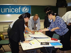 『ユニセフ・キャラバン・キャンペーン』では、基本的に一日目には知事・教育長への表敬訪問及び教職員・指導主事対象の研修会、二日目には学校でのユニセフ学習会を実施します。知事・教育長への表敬訪問では、知事・教育長とのメッセージ交換を行い、県内でのユニセフへの支援に感謝を表すとともに、引き続きのご理解とご協力をお願いしました。 県内の教職員、指導主事の方々を対象とした「ユニセフ研修会」では、ユニセフの活動や特長についての説明に加え、「子どもの権利条約」についてのアクティビティ(子どもに優しい“まち”をつくろう)を行いました。 研修会の参加者からは、「子どもが笑って過ごせる世の中にしていくことは、大人の義務だということを再認識しました。」「子どもを取り巻く環境をよりよいものにしていく上で、学校の役割・責任の大きさを改めて確認することができました。子どものことを広い視点から見つめ直す機会になりました。」「今回のアクティビティ『子どもにやさしいまちをつくろう』について、自分たちの住んでいる地域について考えていくだけでも“子ども”にとっての事業であるということが実感できた。まずは身近にいる子どもたちのことを考えていき、全県、全国、そして地球全体へと視野を広げていきたい。」など、さまざまな感想が寄せられました。 ![]() ![]() 学校のプログラムでは、まず、ビデオ「ユニセフと地球のともだち」を上映。世界の子どもたちの現状とユニセフの活動についてお話をした後、児童・生徒の皆さんに体験学習をしてもらいました。体験学習では、ネパールで毎日の水くみに実際に使われている水がめを運んだり、マラリアの原因となるハマダラ蚊から子どもや家族を守るための蚊帳の中に入ったりしました。これらのプログラムを通して、世界の子どもたちの現状についての理解を深め、途上国で生きる子どもたちのために、自分にできることを考えてもらいました。 子どもたちからは、「私はユニセフの方々のおかげでたくさんの事を知ることができました。きれいな水を飲めない事、学校に行けない事、家計のために働かなくてはならない事、どれも私達にとって信じられない事ばかりでした。」「私たちの生活がどんなに幸せなものかが分かり、これからは他の人の事も考え、行動したいです。」「世界には予防接種が受けられず、病気で命を失う子ども、きれいな水が飲めない子ども、学校に行けない子ども、戦争にまきこまれる子どもたちがたくさんいます。私はこのことを知って『自分はここでこんなことをしていていいのか?』と何もできない自分に腹が立ちました。これからは、募金をしたりして同じ地球に住む人間として、子どもとして、世界中の恵まれない子どもたちのためにユニセフに協力したいと思います。」などの感想が寄せられました。 今回のキャラバンでも、ユニセフを応援してくださるたくさんの方々と出会い、有意義なキャンペーンを終えることができました。ユニセフ・キャラバン・キャンペーンを受け入れていただきました各県教育委員会および訪問校の皆さま、関係の皆さまに心より御礼を申し上げます。 ![]() ![]() © 日本ユニセフ協会 学校事業部 |