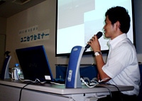 ユニセフハウスの展示見学後、東海大学文学部広報メディア学科准教授 五嶋正浩氏・江東区立第五大島小学校 牧孝信氏よりそれぞれ授業実践の報告をいただきました。五嶋氏からは、岩手県大船渡市で行った「夏休みこどもテレビ局プロジェクト」と、1分間の映像作品にそれぞれのメッセージを込める「One Minute Videoプロジェクト」について、映像制作を通じた国際理解、異文化理解の可能性をお話しいただきました。