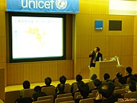 第45回ユニセフ研修会実施のご報告2012年1月26日(木)、27日(金)に第45回ユニセフ研修会(文部科学省後援)を実施いたしました。ユニセフ研修会は、昭和42年から始まり、開発途上国の子どもたちが直面している厳しい現状とユニセフ活動および学校募金の意義について理解を図るとともに、学校教育での推進の充実に役立てていただくことを目的として、各地域の校長会の代表者、各教育委員会のユニセフ担当者、指導主事の方々を対象に毎年実施しています。今年は、両日合わせて57名の方々が参加しました。 一日目プログラム