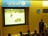 一日目の初めには、昨年から続いているユニセフの東日本大震災支援活動について、東日本大震災支援本部の菊川穣より報告させていただきました。多くの学校のみなさまからもいただいた大きなご支援に御礼を申し上げるともに「子ども」の視点に立ったユニセフの緊急・復興支援活動について、実際の現地での活動を写真と映像で報告いたしました。参加者の方々は、ユニセフハウスの展示スペースも見学し、展示物などについてガイドから説明を受けました。