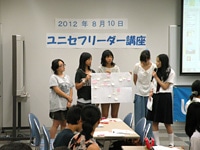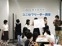 2012年8月10日(金)、ユニセフハウスにて中学生・高校生を対象としたユニセフリーダー講座を開催しました。当日は、広島や長野など遠方からの参加者を含め、全国から80名の中学生・高校生及び約20名の同行の先生方や保護者の方々が参加してくださいました。