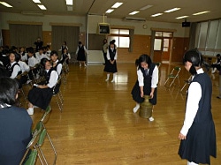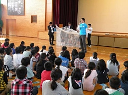 学校でのプログラムは、まず、ビデオ「ユニセフと地球のともだち」を上映。世界の子どもたちの現状とユニセフの活動についてお話をした後、児童・生徒のみなさんに体験学習をしてもらいました。体験学習では、ネパールで毎日の水汲みに実際に使われている水がめを運んだり、マラリアの原因となるハマダラ蚊から子どもや家族を守るための蚊帳の中に入ったりしました。これらのプログラムを通して、世界の子どもたちの現状についての理解を深め、途上国で生きる子どもたちのために、自分にできることを考えてもらいました。