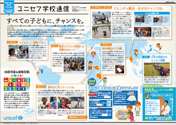 壁新聞型の「ユニセフ学校通信」は、世界各地で子どもたちが直面している危機、活躍する若い力やイノベーション、支援の成果などを楽しく読んでいただけるポスター資料です。