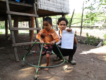 誇らしげに息子の出生登録書を見せるお父さん