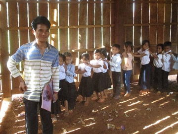 カンボジア北東部・ラタナキリ州の小学校で先生と遊ぶ子どもたち