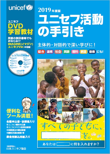校内で掲示したり、街頭募金の際に持って活動できるテーマポスターと、折ると募金袋になる児童用チラシ(子どもチラシ)は、黄色を基調とした明るいイメージのものを採用しました。また、2019年度の「ユニセフ活動の手引き」付録のDVDには、世界の子どもたちの状況が分かる短い動画コンテンツのほか、IMAGINEのユニセフバージョンや日本ユニセフ協会大使の長谷部誠さん(サッカー選手)からのメッセージ動画なども収録しました。