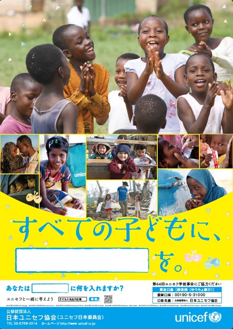 ユニセフ学校募金は、約60年前、日本の子どもたちが、戦後のユニセフからの支援の恩返しのために学校で始めた「ユニセフ協力募金」から始まりました。皆さまからの心のこもったご支援のおかげで、世界の子どもたちの状況は良くなってきています。一方で、未だ年間540万人の子どもたちが5歳の誕生日を迎えることなく命を落とし、6,300万人もの就学年齢の子どもたちが小学校に通えていないなど、“取り残されている”子どもたちも多くいます。ユニセフは、すべての子どもの命と権利が守られる世界の実現を目指し、活動を続けてまいります。どうか引き続き、あたたかいご支援、ご協力賜りますよう、何卒よろしくお願い申し上げます。