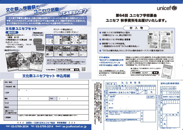 (文化祭ユニセフセット請求用紙、We Support UNICEF賞申込用紙、ユニセフ募金振込用紙つき) -