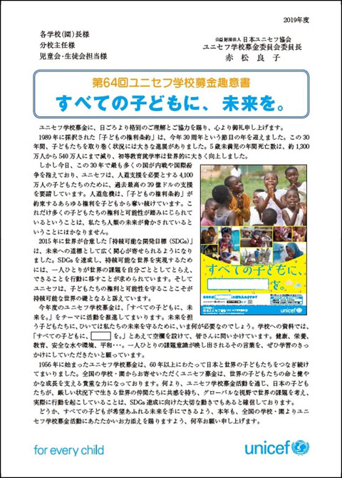 今年度のユニセフ学校募金は、「すべての子どもに、未来を。」をキャンペーンテーマに、活動を推進していきます。