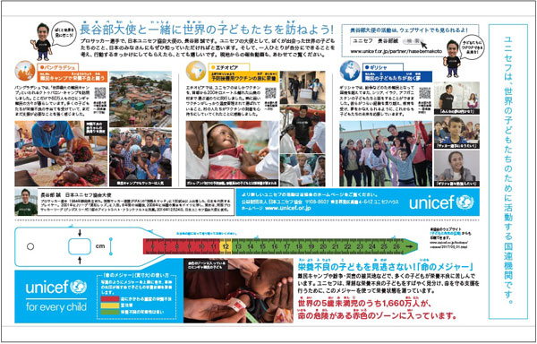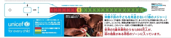 今年も、昨年ご好評をいただいた「命のメジャー」を封筒裏面に実寸大で印刷しました!学校現場からのご要望も多い「命のメジャー」は、子どもの栄養不良を簡易的に調べるためのもので、ユニセフの活動現場で大活躍しています。栄養不良の子どもたちの腕がどのくらい細いのか、メジャーを切り取って測ってみると、その細さに驚かれると思います。