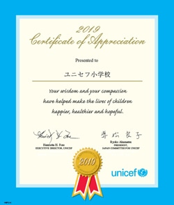 昨年度(2018年4月~2019年3月)、ユニセフ募金に協力いただいた学校のみなさまには、感謝状も同封されておりますので、ぜひ校内に掲示いただき、児童・生徒のみなさまに感謝のメッセージをお伝え下さい。