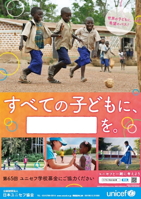 今年も昨年に引き続き、「すべての子どもに、 を。」と、子どもたち自身が空欄に入る言葉を考え、埋められるようなポスター・チラシを制作しました。主体的で対話的な学びに基づく募金活動を皆さまの学校・園で展開していただくことを願っております。