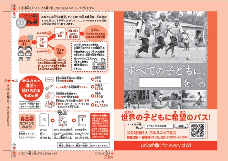 テーマポスターに登場する子どもたちのお話や、みなさんからの募金でできることなどを紹介しています。折ると封筒になって「募金袋」としてもお使いいただけます。小・中学校には、児童・生徒数分をお届けしておりますが、小・中学校以外からもご請求いただけます。