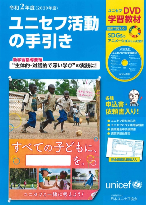ユニセフの歴史や活動について分かりやすくまとめた「ユニセフ早わかり」ページや、コピーして授業で配ることもできる「世界の子どもたちは、いま」等の教材ページのほか、出前授業や貸出教材などの申込書、ゆうちょ銀行でお使いいただける手数料免除の振込用紙などが詰まった手引き書です。