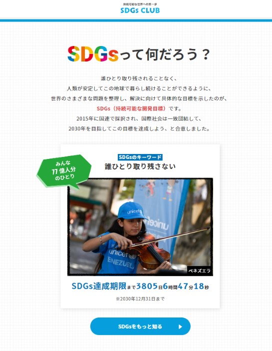 しかし、意外と知られていないのが、その中身。SDGs CLUBでは、17の目標の下にある169個の“ターゲット”を子ども訳しました!子どもも、大人も、楽しくSDGsを学べる新設ウェブサイト「SDGs CLUB」をぜひご活用ください。