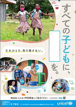 ユニセフ学校募金は、66年前、日本の子どもたちが、戦後のユニセフからの支援の恩返しのために学校で始めた「ユニセフ協力募金」から始まりました。みなさまからの心のこもったご支援のおかげで、世界の子どもたちの状況は良くなってきています。一方で、未だ年間520万人の子どもたちが5歳の誕生日を迎えることなく命を落とし、5,900万人もの就学年齢の子どもたちが小学校に通えていないなど、“取り残されている”子どもたちも多くいます。ユニセフは、すべての子どもの命と権利が守られる世界の実現を目指し、活動を続けてまいります。どうか引き続き、あたたかいご支援、ご協力賜りますよう、何卒よろしくお願い申し上げます。