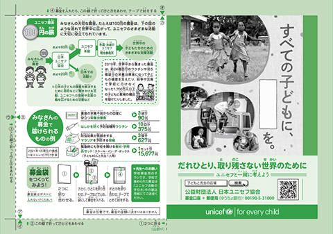 みなさんの募金でできることやユニセフの活動を児童・生徒のみなさんにわかりやすく紹介しています。折ると封筒になって「募金袋」としてもお使いいただけます。小・中学校には、児童・生徒数分をお届けしておりますが、小・中学校以外からもご請求いただけます。