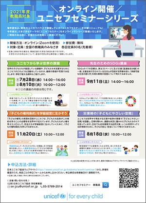 毎年夏休み、東京のユニセフハウスで開催していた「ユニセフセミナー」を大幅リニューアルし、さまざまなテーマの「ユニセフセミナー」をオンラインでシリーズ開催いたします。まわりの先生方にもぜひご案内ください。