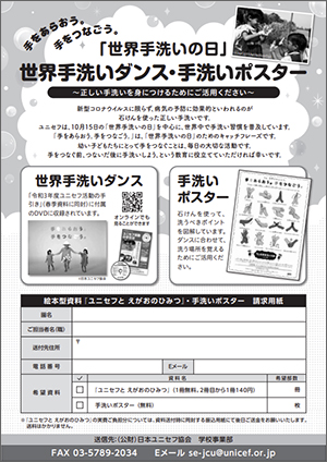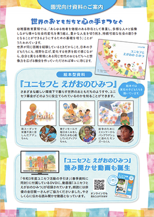 絵本「ユニセフとえがおのひみつ」や「手洗いポスター」、絵本の読み聞かせ動画コンテンツなど、幼稚園や認定こども園でお使いいただける資料をご案内しています。裏面の申込用紙でご注文いただけます。