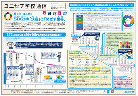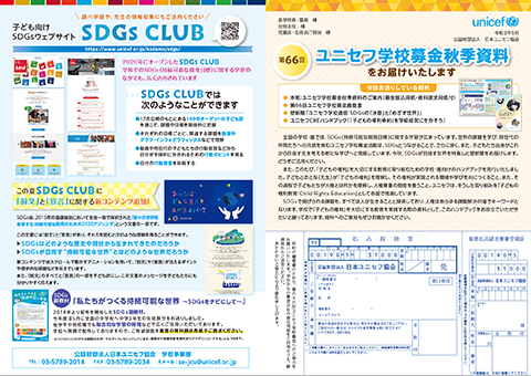 新コンテンツが追加された子ども向けのSDGsウェブサイト「SDGs CLUB」や学校向けの各種資料のご紹介、教材をご請求いただける申込用紙も入っています。