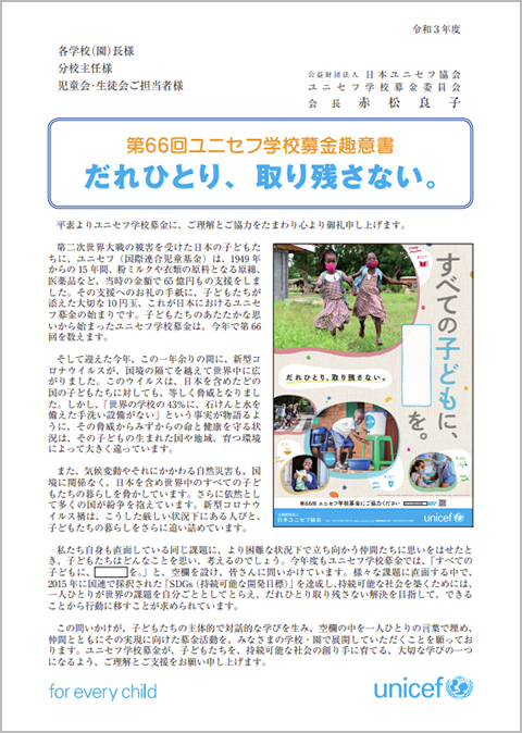 第66回ユニセフ学校募金活動へのご理解とご協力を賜り、ありがとうございます。