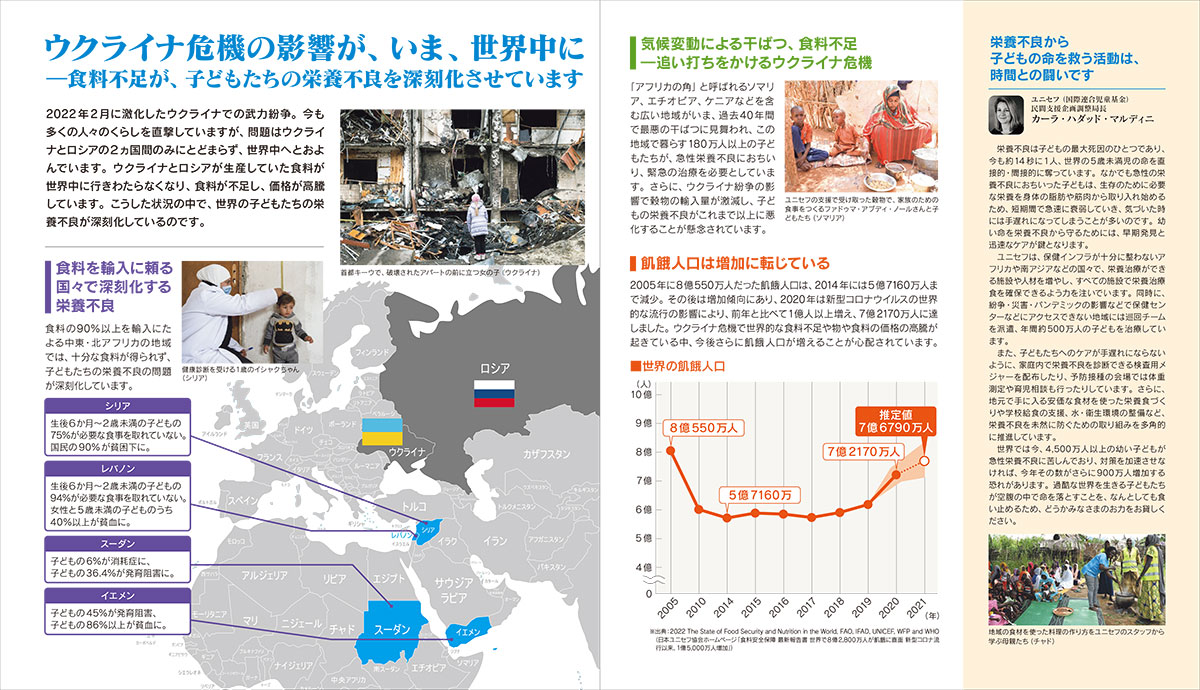 今回のお手紙のテーマは「ウクライナ危機や気候変動の影響で深刻化する食料不足と子どもたちの栄養不良」。紛争が物の価格の高騰を引き起こし、また気候変動の影響も重なって、食料不足と子どもたちの栄養不良が世界中で深刻化しています。そのような世界の現状を紹介するとともに、栄養不良の子どもたちの命と健やかな成長を守るためにユニセフがどのような活動を行っているかについて、ユニセフ職員が紹介しているコラムも掲載しています。このお手紙を通じて、日本の子どもたちが世界の課題に関心を寄せるきっかけとなれば幸いです。