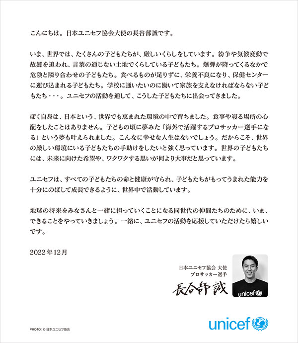 ユニセフ学校募金へのご協力のお願いと、日本ユニセフ協会大使の長谷部誠さん(プロサッカー選手)から児童・生徒のみなさんへのメッセージが入ったお手紙を全国の学校にお送りしています。 (12月初旬~中旬にかけてお届けしています)