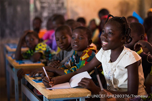 第26回友愛援助(2023年4月から2024年1月)でも、支援先のひとつとしてユニセフが選定されています。ベルマークを通じたご支援は、西アフリカのブルキナファソという国で、「子どもにやさしい学校」を広める活動に役立てられます。厳しい状況下で、教育の機会を奪われがちな子どもたちが、安全な環境で、質の確保された教育を受けられるように、校舎建設や、備品・学用品の提供、先生の養成、地域社会への啓発、緊急事態下の子どもへの教育支援などが実施されます。