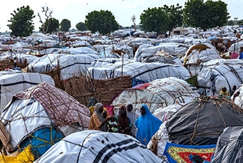 ![]() cUNICEF/UN028919/Esiebo ボルノ州マイドゥグリのムナ・ガレージ国内避難民キャンプのようす。ボコ・ハラムの攻撃から逃れた多くの人が暮らしています。 |