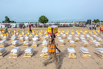 ![]() cUNICEF/UN028915/Esiebo 2016年8月9日、ボルノ州北部マイドゥグリのムナ・ガレージ国内避難民キャンプの食糧配給のようす。 ここには故郷をボコ・ハラムに襲われた人たちが逃げてきています。約240万人がボコ・ハラムの襲撃により国内避難民となっています。 |