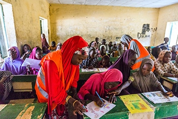 今、フィルドゥさんは、ナイジェリア北東部、ボルノ州マイドゥグリにあるサンダ・カリミ国内避難民キャンプで、心理社会的ケアのボランティアをしています。